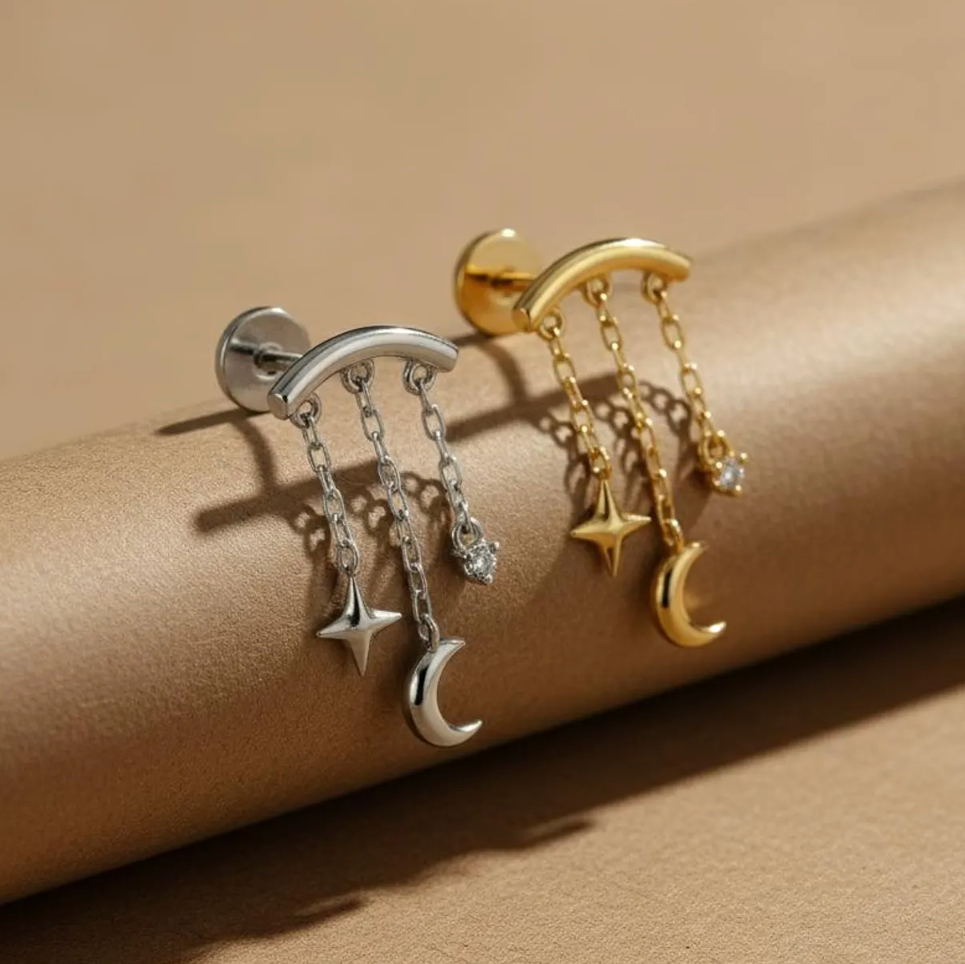 El Celestial Drip captura el movimiento etéreo del cielo nocturno en una pieza delicada y sofisticada. Desde un arco metálico pulido descienden tres cadenas ultrafinas que terminan en una luna, una estrella y un destello brillante que imita la luz de un astro.