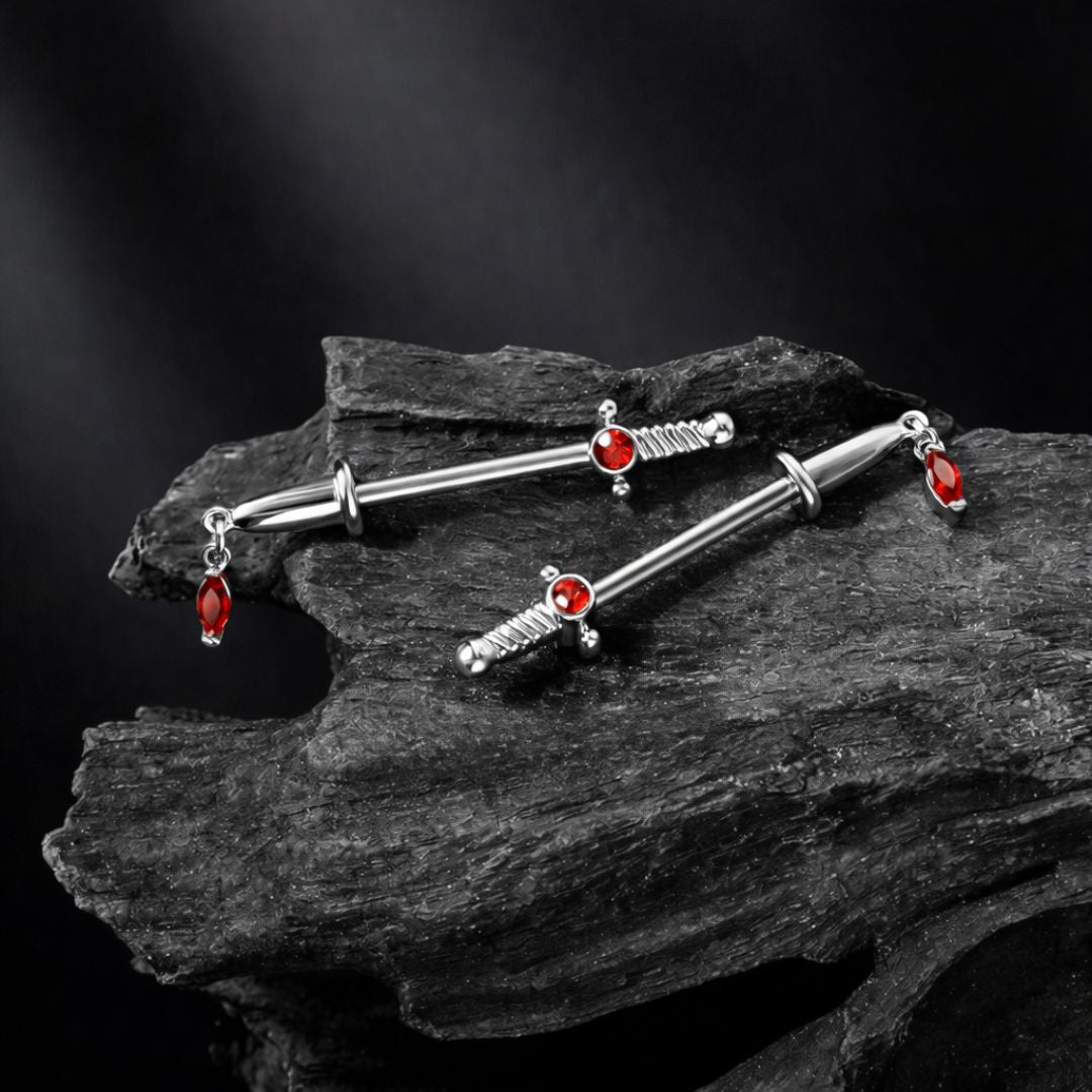 El Crimson Blade Nipple es un piercing de pezón inspirado en la simbología de la espada: fuerza, protección y poder. Su diseño alargado tipo hoja se complementa con una gema roja central y un detalle colgante en forma de lágrima, que aporta movimiento y un contraste visual intenso.