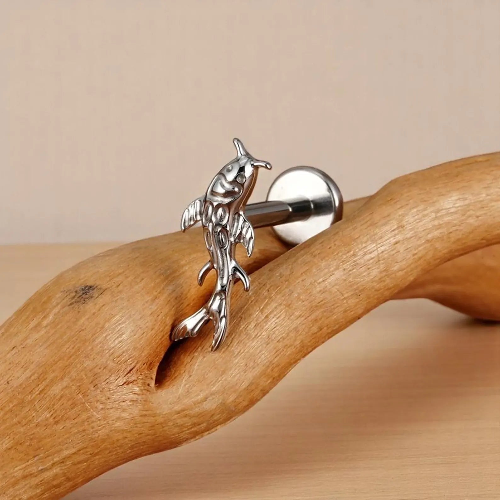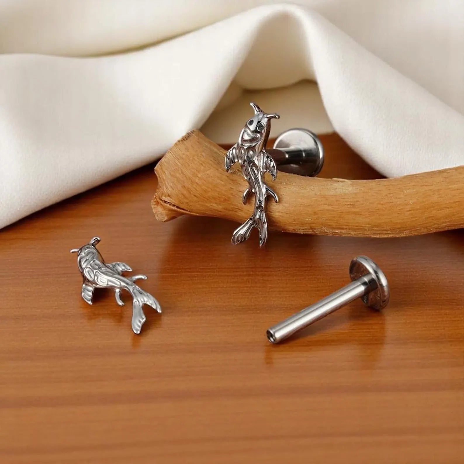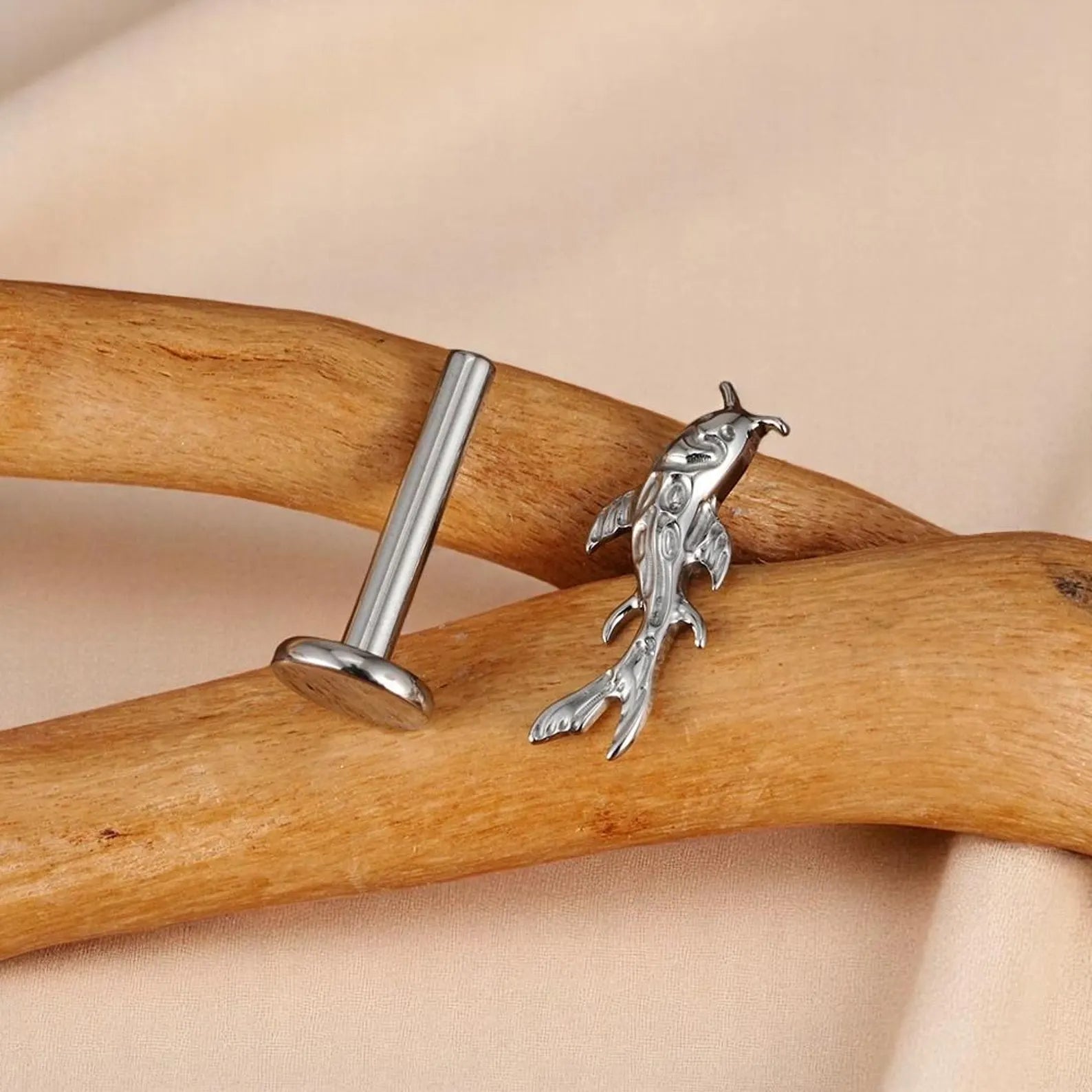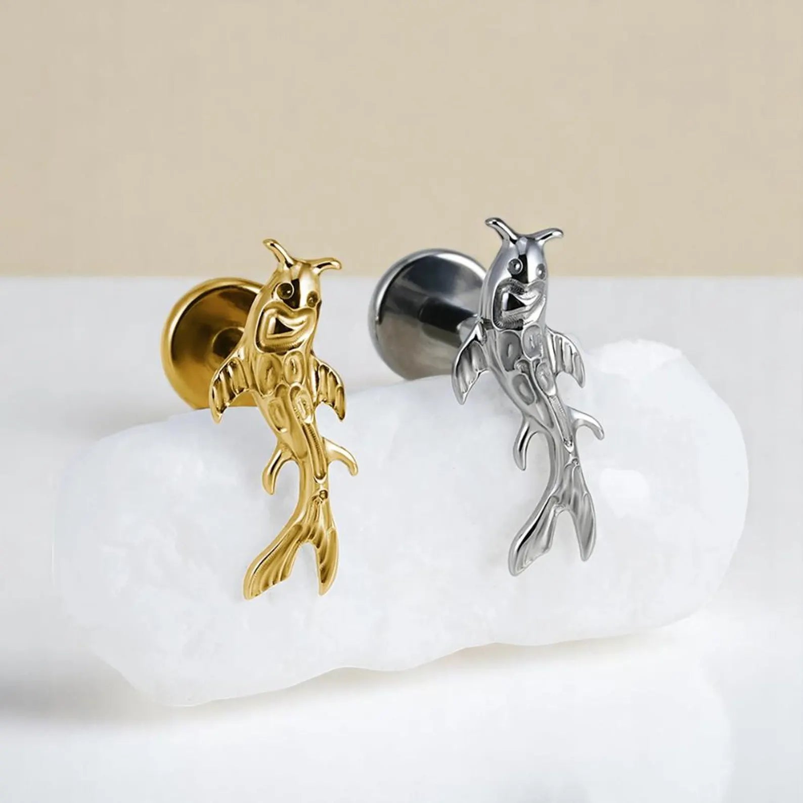 El TotemFin Spirit fusiona estética tribal con líneas suaves y orgánicas, creando una pieza que parece salida de un talismán contemporáneo. Su silueta totémica con forma de criatura acuática aporta misterio, simbolismo y elegancia alternativa a cualquier ear curation.