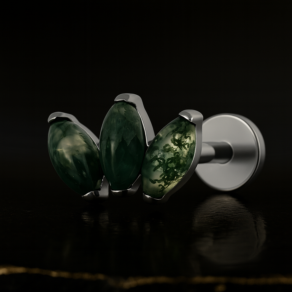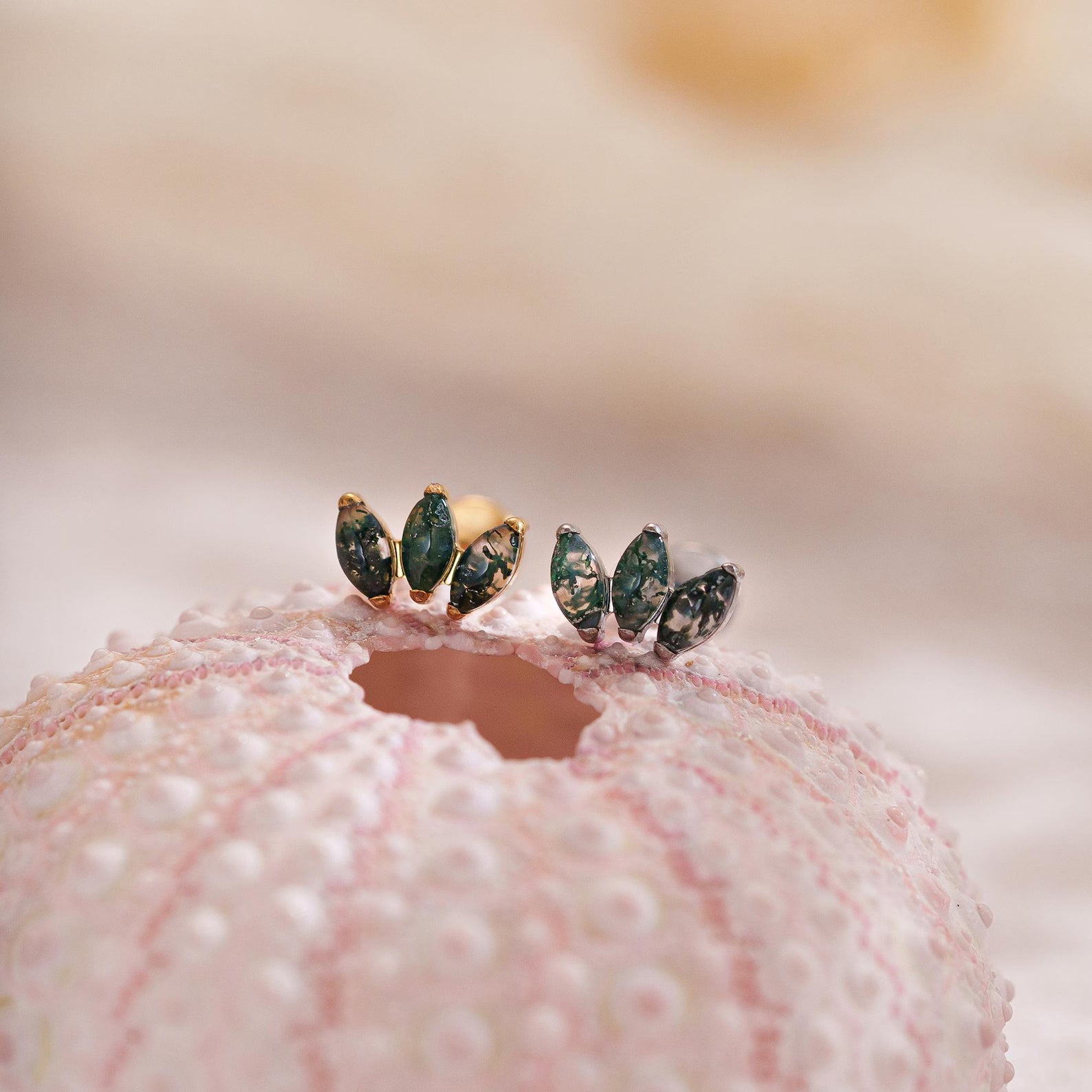 El Moss Trinity reúne tres gemas estilo moss agate en un diseño que evoca raíces, bosque y magia ancestral. Cada piedra presenta vetas verdes únicas, como paisajes encapsulados en miniatura, creando una pieza orgánica y sofisticada al mismo tiempo.