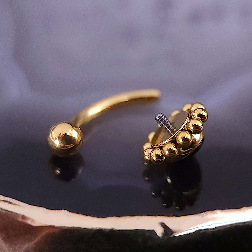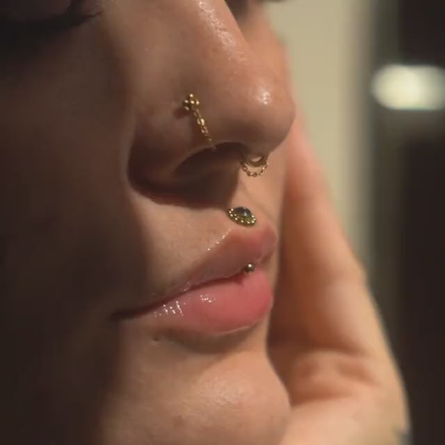 Su forma curva se adapta perfectamente a perforaciones de rook o ceja, ofreciendo comodidad sin sacrificar impacto estético. El contraste entre la profundidad de la piedra y el brillo del metal aporta una identidad dark, sofisticada y atemporal, ideal para quienes buscan una joya distinta, con carácter y detalle.