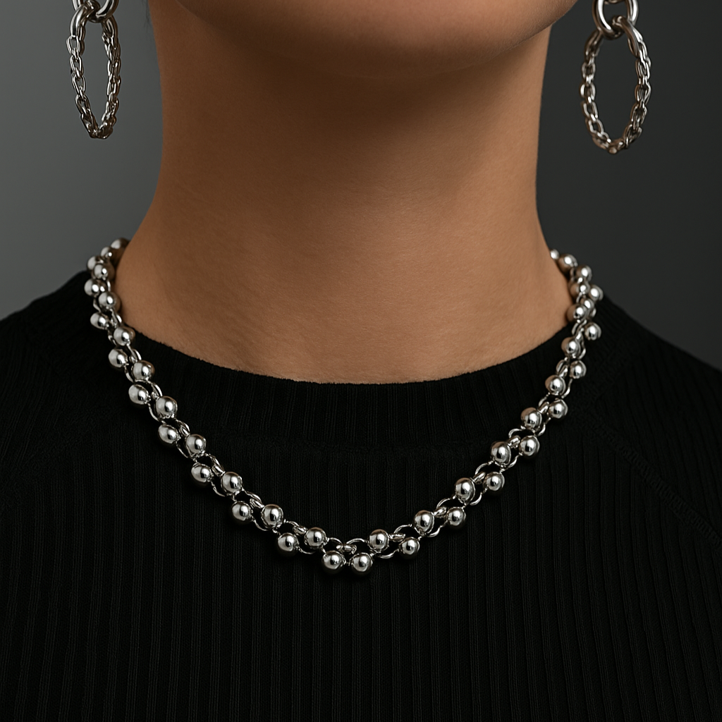 Un diseño que desafía la simetría y la convierte en arte. El set Nebula Mesh combina esferas pulidas entrelazadas con precisión para lograr una textura dimensional que refleja la luz con cada movimiento.